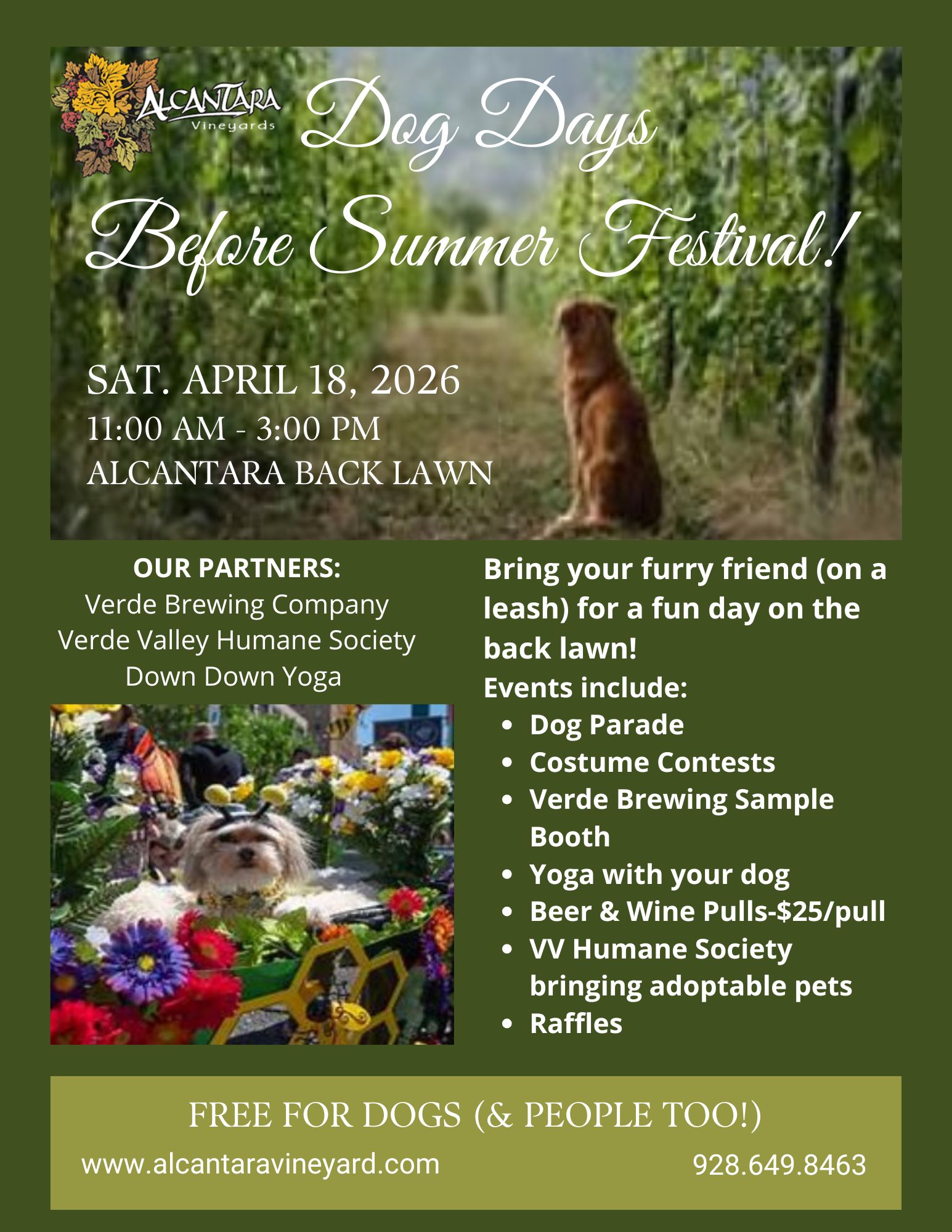 Join us for a fun and dog-filled day on our Back Lawn. Events include a dog parade, costume contests, raffles, yoga with your dog, vendor booths and a Verde Brewing Company beer sampling booth. We will be doing wine and beer pulls for $25/each, and the Verde Valley Humane Society will be bringing adoptable pets.