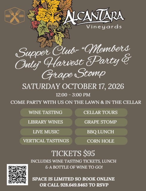 Supper Club-Harvest Party & Grape Stomp Our Wine Club Members are invited to join us for a Supper Club Lunch + Add to Google Calendar + iCal / Outlook export 00 days 00 hours 00 minutes 00 seconds Date Oct 17 2026 Time 12:00 pm - 3:00 pm Location Alcantara Lower Lawn Category Events Share this event Recent Posts Uncorked Chronicles Edition 3: A Vineyard Wedding Straight Out of a Storybook Uncorked Chronicles Edition 2: Unforgettable Group Getaways at Alcantara Vineyards Uncorked Chronicles Edition 1: Celebrate Life’s Milestones at Alcantara Vineyards Who is Alcantara Vineyard and Winery and how do you grow grapes in the desert? Recent CommentsArchives December 2025 November 2025 September 2025 December 2017 Categories Arizona Wine Country Running a Vineyard uncorked