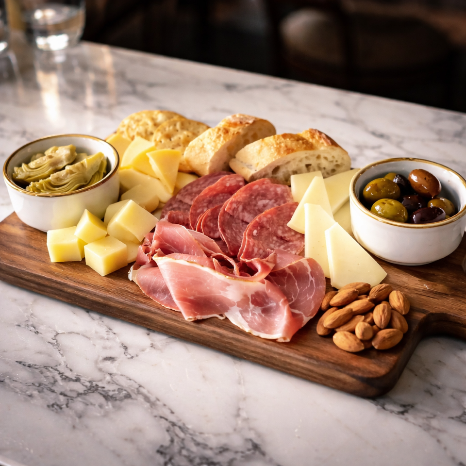 Prosciutto and salami paired with assorted artisan cheeses, artichokes, and olives. Served with a selection of breads and crackers.